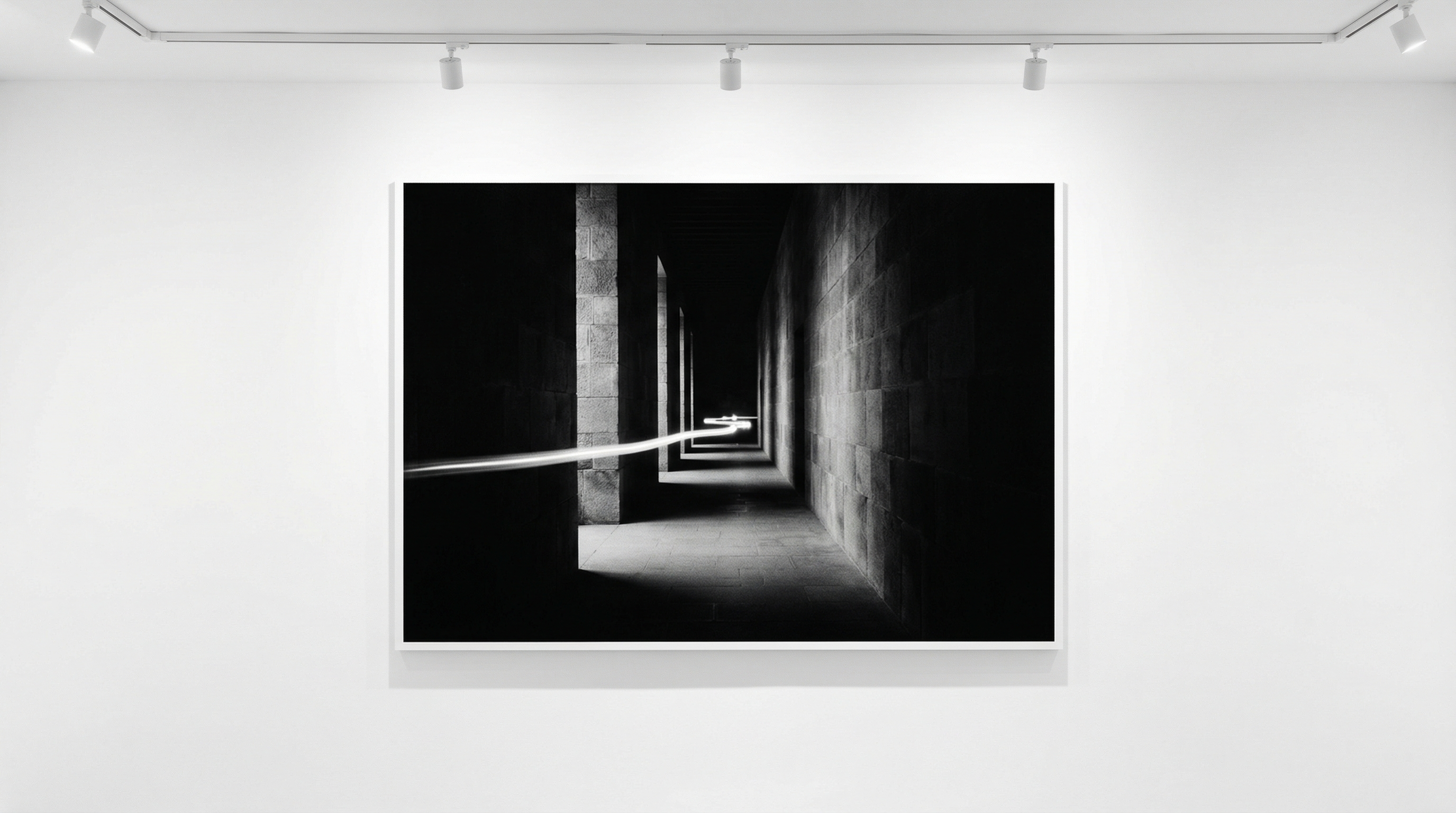 - Full-bleed exhibition grid — long-exposure architectural prints presented at scale, hover reveals title and year only